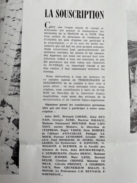 Maurice Pagat a alors 40 ans. Né en 1929 à Saint Etienne et mort en 2009, il sera une figure du catholicisme social et de l’anarchosyndicalisme. Il créera le syndicat des chômeurs dans les années 1980 (on trouve sur lui de nombreux articles dans différents journaux et revues dont Le Monde[1] et La Croix. Voir annexe 11.). Dans les années 1960, Maurice Pagat dirige la revue Témoignages et Documents fondée par le Comité Audin pour lutter contre la guerre en Algérie et dénoncer les actes de torture (il a été licencié par EDF pour cet engagement). A la lecture des noms des personnes qui ont participé à la souscription pour la restauration de la maison de la paix (بيت السلام), on constate que Maurice Pagat devait avoir un vrai talent de conviction et d’entraînement : on y trouve deux ministres, la direction de la rédaction de l’Express (alors dirigé par JJSS, partisan de la décolonisation), Roger Vadim, Jules Roy, Alain Resnais, etc.