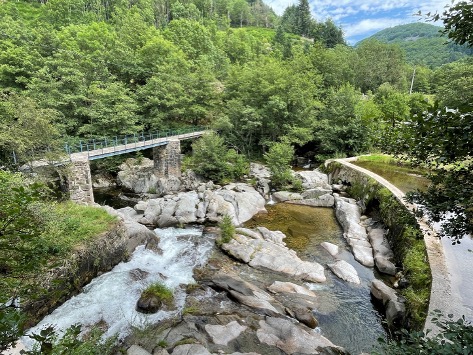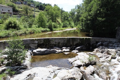 - La passerelle qui surplombe la Dorne et relie le moulinage à la route de Vals.