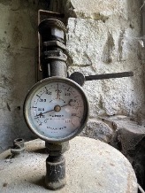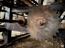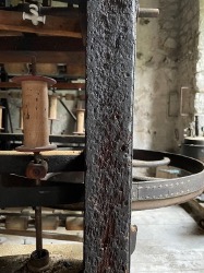 Commande d’embrayage du moulin : en baissant ce levier on fait passer la courroie sur la roue solidaire de l’axe. Inversement, en tirant les ouvrières mettaient le moulin à l’arrêt.