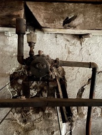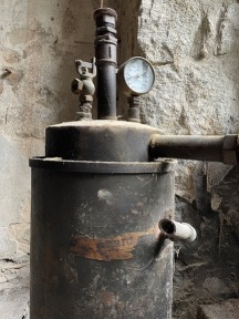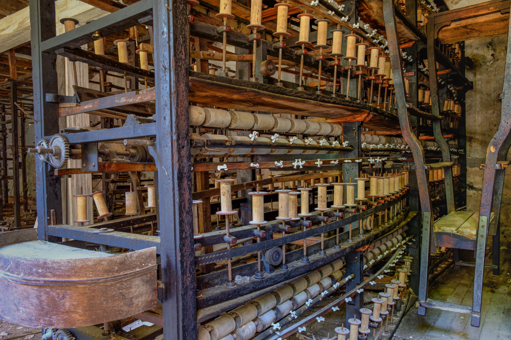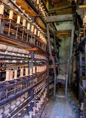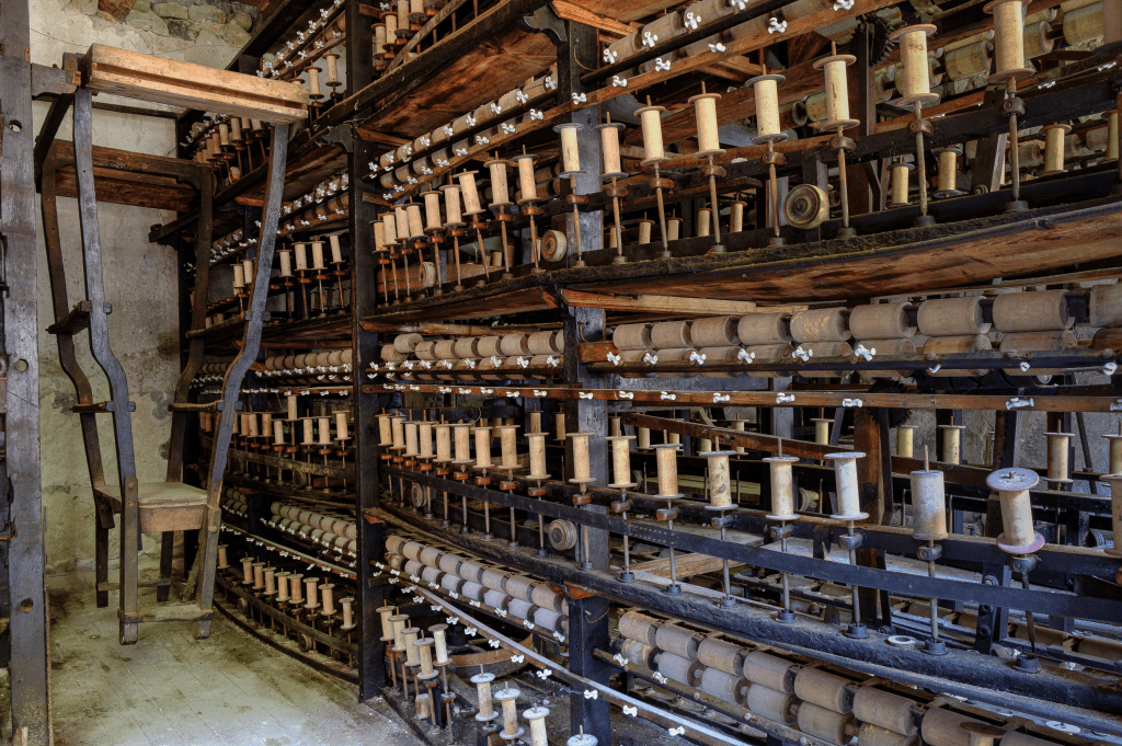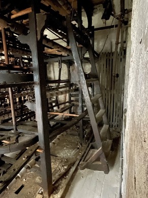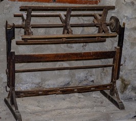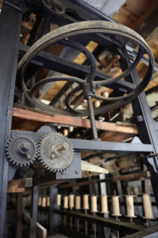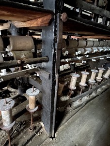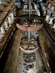 Chariot mobile sur lequel montaient les ouvrières pour accéder aux vargues supérieures. Ils ont tous été conservés. Ici entre moulins 7 et 8.