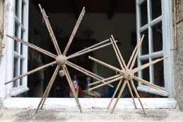 Flotteur conçu pour remettre en flottes la soie moulinée reçue d’abord sur bobine. L’une des 4 branches se replie pour faciliter le retrait des flottes.