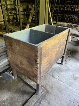 Bac de trempage. Il peut avoir deux fonctions : (i) mouiller les flottes de soie grège en les assouplissant avec une solution huileuse rajoutée à l’eau (préalable au dévidage), (ii) teinter sommairement les flottes de soies moulinées avec une coloration fugace pour que le tisseur repère au premier coup d’œil la torsion du fil (selon convention entre mouliniers et tisserands).