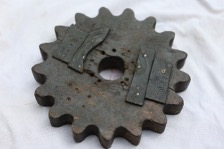 Roue réparée avec du cuir. On remarque l’usure de certaines dents.